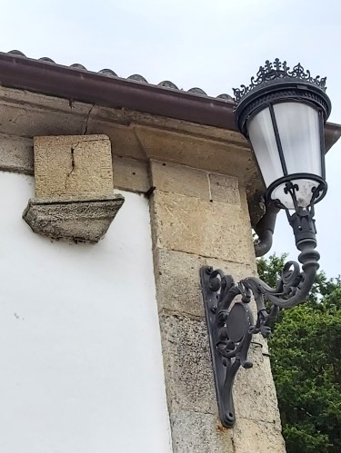 La señalización del Camino nos dirige hacia la izquierda y la seguiremos, pero debemos ser cuidadosos ya que un momento después, al llegar a una rotonda, las flechas nos guían por dirección prohibida por lo que tenemos la opción de desmontar unos metros o bien subir por la calle que queda a nuestra derecha y girar después a la izquierda para, después de una breve bajada, volver a encontrarnos con las flechas. De cualquiera de las dos maneras terminaremos enfilando una calle adoquinada que pasa bajo un arco. El lugar merece que nos detengamos para examinarlo con calma.