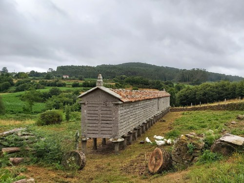 De Os Muiños saldremos hacia la izquierda por una bonita carreterita que discurre paralela a la costa, aunque a mayor altura, lo que nos permitirá rodar un par de kilómetros escuchando el oleaje. por aquí pasa también, aunque en sentido contrario al que llevamos, el Camiño dos Faros que abandonamos, al igual que el asfalto, a la entrada al pueblo de Merexo. Aquí tomamos una pista de tierra ascendente que nos aleja ya definitivamente de la costa y que nos lleva, con bastante esfuerzo, hasta Vilar de Sobremonte, desde donde solo tenemos que dejarnos caer unos metros para alcanzar otro de los lugares mágicos de este tramo: el antiguo monasterio de San Martiño de Ozón y su iglesia de origen románico (aunque las reformas llevadas a cabo en los siglos XVII y XVIII apenas dejaron restos del original). Lo más llamativo del conjunto es el hórreo donde se almacenaban las rentas pagadas al monasterio, que tiene nada menos que 27 metros de largo y consta de 22 pares de pies, lo que lo convierte en uno de los hórreos más grandes de Galicia y nos habla de lo rico que llegó a ser este monasterio allá por el siglo XVI.