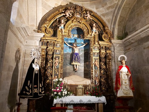Para compensar, la ermita posee un pequeño altar exterior cubierto sobre el que se encuentra una gastada representación en granito de la virgen y numerosas ofrendas que los peregrinos dejan allí a su paso (bastante más variadas y generosas que las piedras dejadas a los pies del cruceiro mencionado un poco antes). Hay también una pequeña caja incrustada en la pared conteniendo un libro donde los que por aquí pasan pueden reflejar sus pensamientos.