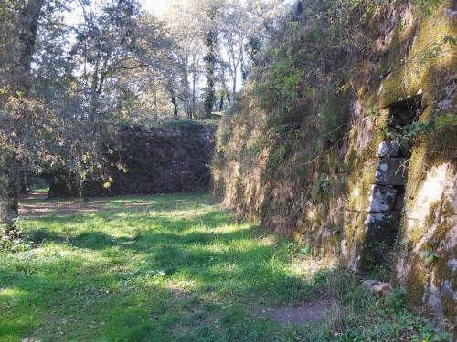 Cuando nos encontramos justo a la altura del extremo sur de la península que acabamos de abandonar, y tras pasar junto a un hotel, vemos que de la carretera que nos acompaña surge, a nuestra izquierda, una pequeña pista ascendente con firme asfaltado pero en lamentable estado. Si abandonamos nuestra ecopista y subimos por la carreterita llegaremos al fuerte de San Francisco de Lovelhe (o de Azevedo, o simplemente de Lovelhe), una fortificación muy similar a las de Monção o Valença, con la peculiaridad de que aquí no hay ninguna ciudad y puede apreciarse su estructura de cinco baluartes sin la interferencia de construcciones modernas. Este fuerte, construido en el siglo XVII, reconstruido en el XVIII y dañado y abandonado en el XIX, colaboró con la atalaya de Lovelhe (en el monte de la Encarnación de vemos tras él) y con el cercano castillo de Vila Nova de Cerveira en la defensa de este tramo del Miño.