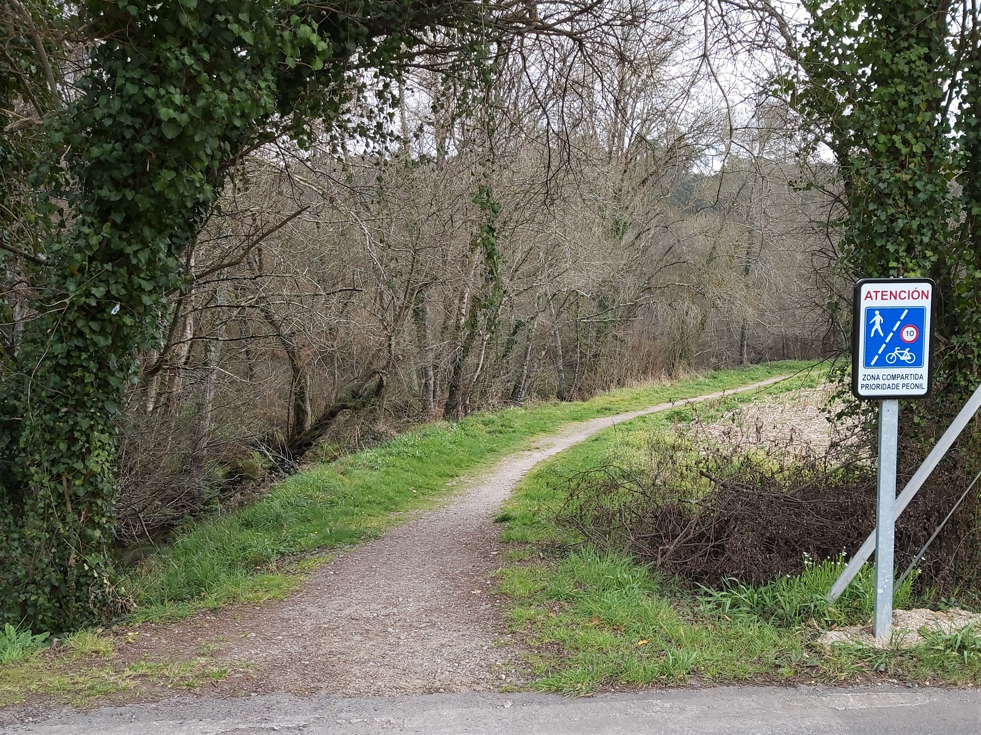 Seguimos, sin desviarnos, la carreterita que poco a poco vuelve a acercarnos a la AP-9 para terminar cruzándola, esta vez por debajo. Al poco, dejamos el asfalto para tomar un camino que aparece a nuestra izquierda y que se adentra en un bosque de pinos. En este tramo nuestro compañero de ruta será el regato do Folón, un riachuelo que se acerca tanto a nuestro camino que tendremos que llegar a compartirlo con él en un tramo en el que algún alma caritativa ha construido una acera de piedra algo más elevada para que los peregrinos no se vean obligados a mojarse los pies (si bien el regato no parece muy profundo, el blando suelo arenoso que se ve bajo el agua no invita a pedalear por él). Poco después de este punto (que está señalizado para que los ciclistas tengamos precaución, pero solo para los que vienen en dirección contraria) salimos de nuevo al asfalto uniéndonos a una carreterilla que transita entre casas.